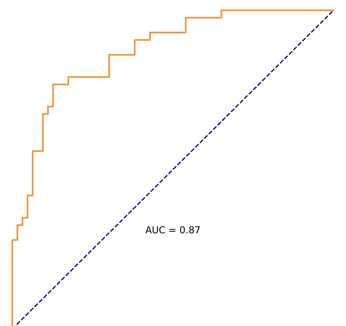 (2) ROC figure of PhenoScore, this figure presents the Receiver Operating Characteristic (ROC) curve for the PhenoScore model in a binary classification task. The x-axis represents the False Positive Rate (FPR), and the y-axis represents the True Positive Rate (TPR). The area under the curve (AUC) is 0.XX, indicating the model's overall performance in distinguishing between positive and negative samples. An AUC value close to 1 signifies high discriminative ability, whereas an AUC value of 0.5 indicates performance equivalent to random guessing.